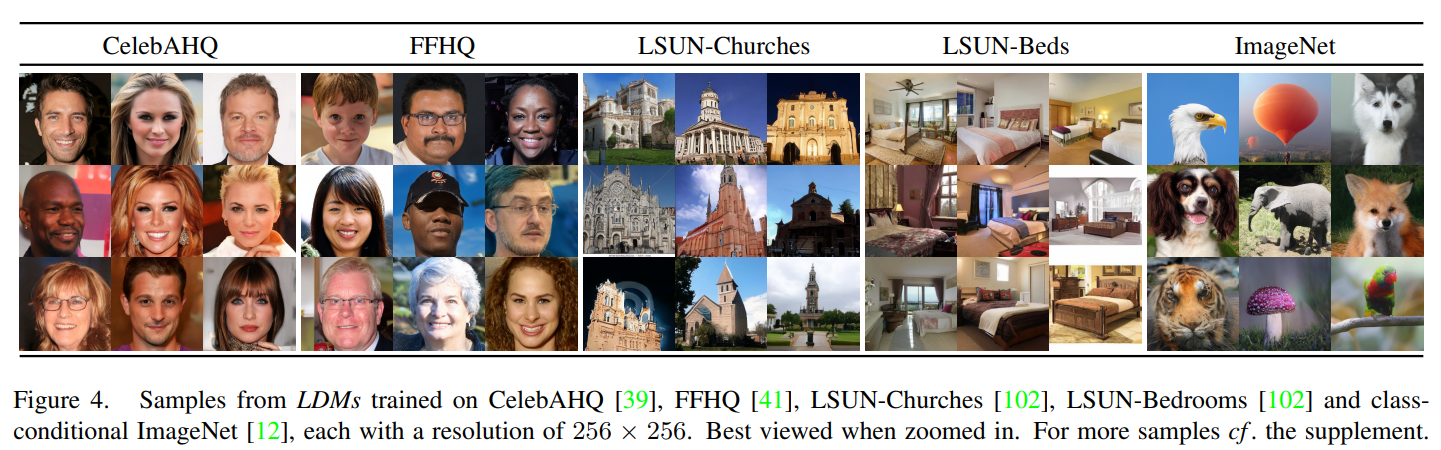 图4 来自在CelebAHQ 、FFHQ 、LSUN-Churches、LSUN-Bedrooms和类条件ImageNet 上训练的LDMs的样本,分辨率为256×256。