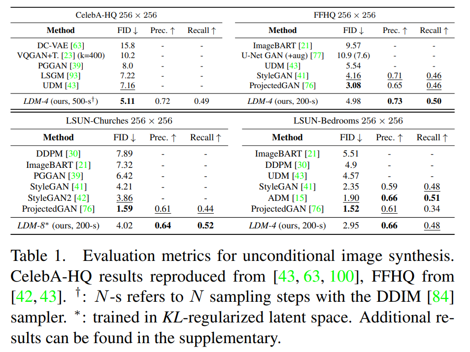 表1 无条件图像合成的评价指标。CelebA-HQ结果自[43,63,100],FFHQ结果自[42,43]。†:N-s为DDIM采样器的N个采样步长。*:在KL正则化的潜在空间中训练。