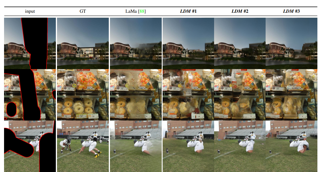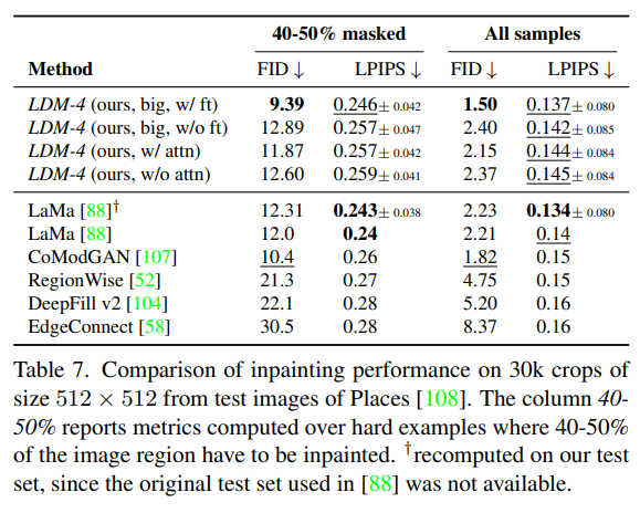表 7 中与其他修复方法的比较表明,与 文献[88] 相比,我们的注意模型提高了 FID 测量的整体图像质量。未蒙版图像和我们的样本之间的 LPIPS 略高于文献 [88]。我们将其归因于文献[88] 仅产生单一结果,与我们的 LDM cf 产生的不同结果相比,该结果往往恢复了更多的平均图像。图 21。此外,在一项用户研究(表 4)中,人类受试者更喜欢我们的结果,而不是文献 [88] 的结果。