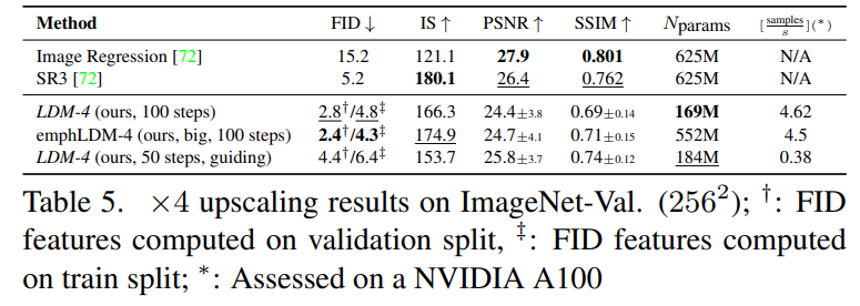 表5 ×4 ImageNet-Val 上的升级结果。(256x256);†:在验证分割上计算的 FID 特征,‡:在训练分割上计算的 FID 特征;∗:在 NVIDIA A100 上评估。