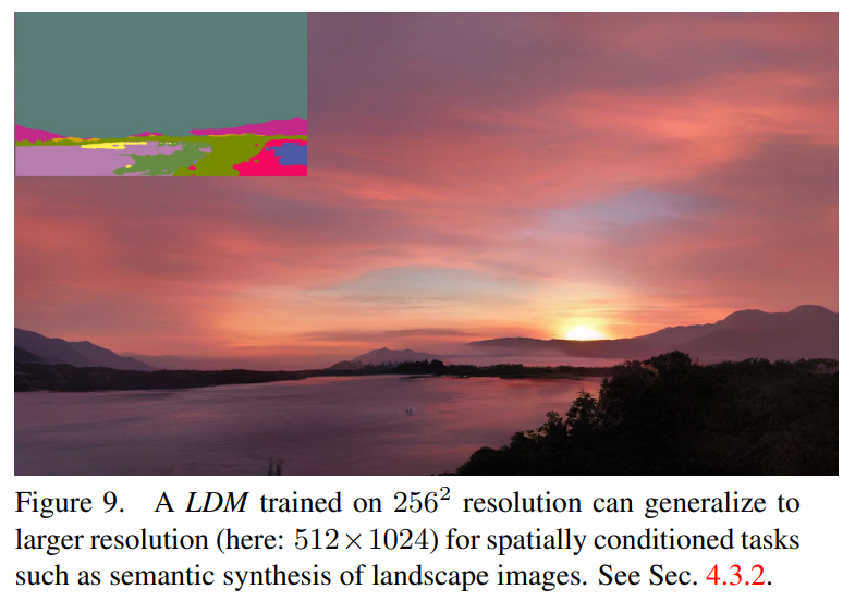 图9 在 256x256 分辨率下训练的 LDM 可以推广到更大的分辨率(此处:512×1024),用于空间条件任务,例如景观图像的语义合成。请参阅第 4.3.2 节。