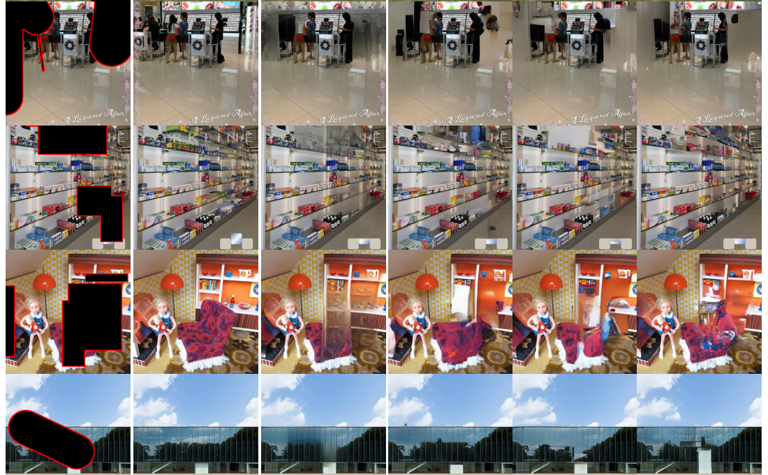 表7 对 Places测试图片中 30k 个 512×512 大小的裁剪图像的修复性能进行比较。40-50% 列报告了针对需要修复 40-50% 图像区域的困难样本计算得出的指标。† 在我们的测试集上重新计算,因为 文献[88] 中使用的原始测试集不可用。