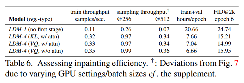 我们首先分析不同设计选择对第一阶段的影响。具体来说,我们比较了 LDM-1(即基于像素的条件 DM)与 LDM-4 的修复效率,包括 KL 和 VQ 正则化,以及第一阶段没有任何注意的 VQ-LDM-4(见表 8),其中后者减少了在高分辨率下解码的 GPU 内存。为了便于比较,我们固定了所有模型的参数数量。表 6 报告了分辨率为 256x256 和 512x512 的训练和采样吞吐量、每个 epoch 的总训练时间(以小时为单位)以及六个 epoch 之后验证分割的 FID 分数。总体而言,我们观察到基于像素和基于潜在的扩散模型之间的速度提高了至少 2.7 倍,同时 FID 分数提高了至少 1.6 倍。