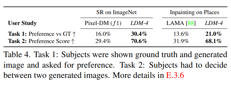 通过直接通过连接对低分辨率图像进行调节,可以有效地训练 LDM 以实现超分辨率(参见第 3.3 节)。在第一个实验中,我们遵循 SR3,将图像退化修复为具有 4 倍下采样的双三次插值,并按照 SR3 的数据处理流程在 ImageNet 上进行训练。我们使用在 OpenImages 上预训练的 f = 4 自动编码模型(VQ-reg.,参见表 8),并将低分辨率条件 y 和 UNet 的输入连接起来,即是恒等式。我们的定性和定量结果(见图 10 和表 5)显示出具有竞争力的性能,LDM-SR 在 FID 中优于 SR3,而 SR3 具有更好的 IS。一个简单的图像回归模型获得了最高的 PSNR 和 SSIM 分数;然而,这些指标与人类感知不太吻合,并且更喜欢模糊而不是不完美对齐的高频细节。此外,我们进行了一项用户研究,将像素基线与 LDM-SR 进行了比较。我们遵循 SR3,其中向人类受试者展示两张高分辨率图像之间的低分辨率图像并询问他们的偏好。表 4 中的结果证实了 LDM-SR 的良好性能。可以通过使用事后引导机制来推动 PSNR 和 SSIM,我们通过感知损失来实现这种基于图像的引导。
