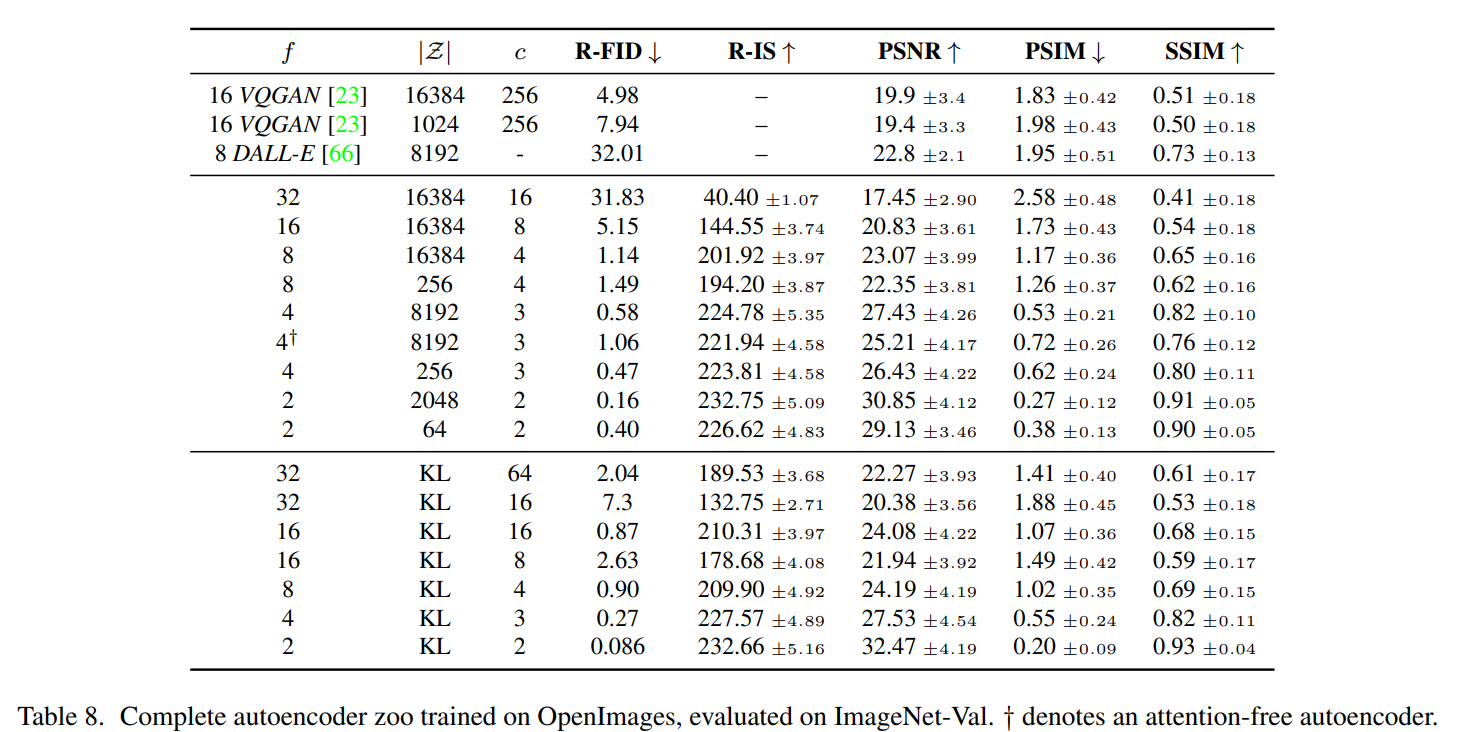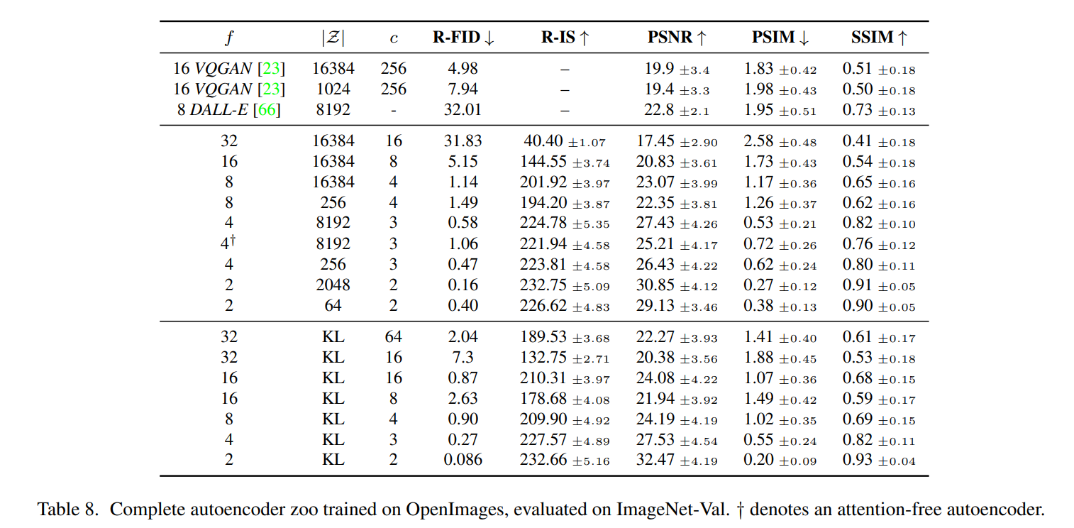 表8 在 OpenImages 上训练的完整自动编码器 zoo,在 ImageNet-Val 上进行评估。† 表示无注意自动编码器。