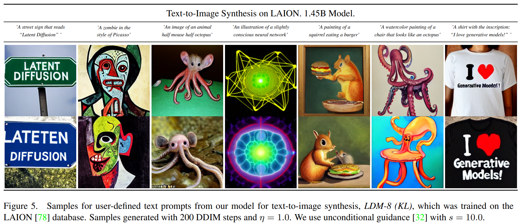 图5 用户定义文本提示的样本来自我们的文本到图像合成模型LDM-8 (KL),该模型是在LAION数据上训练的。用200 DDIM步长和η = 1.0生成的样本。我们使用s = 10.0的无条件指导。