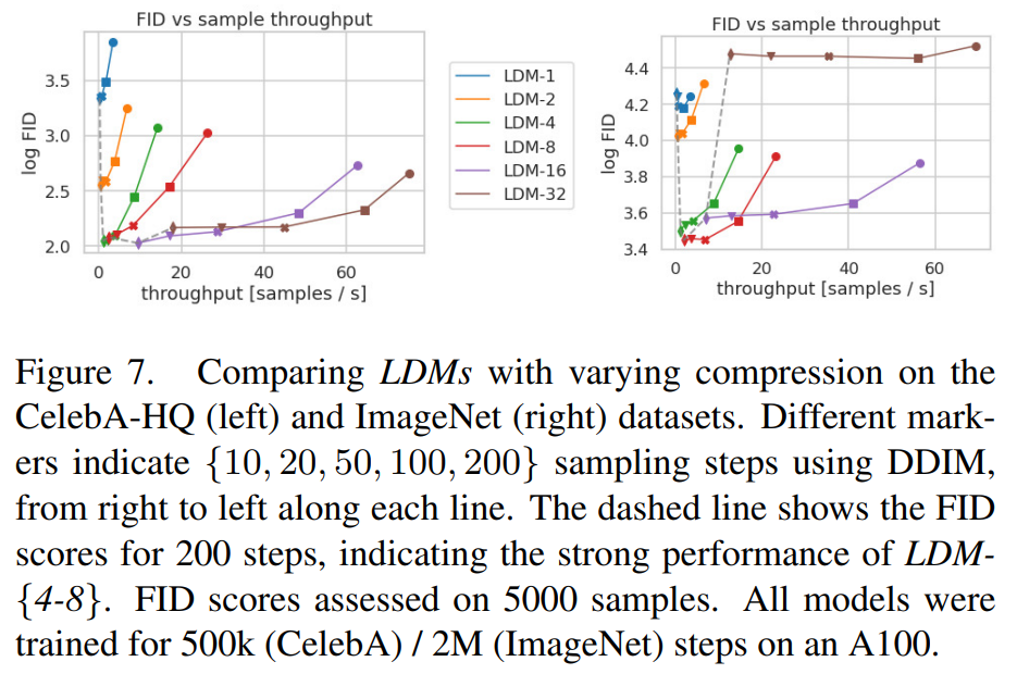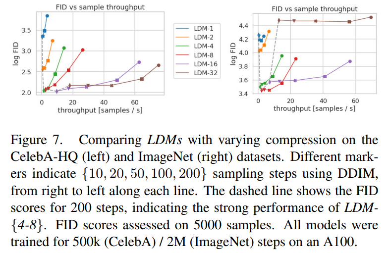 图7 在CelebA-HQ(左)和ImageNet(右)数据集上比较不同压缩的LDMs。不同的标记表示使用DDIM的{10,20,50,100,200}采样步骤,沿着每行从右到左。虚线表示200步的FID分数,表明LDM-{4-8}性能较好。FID评分评估了5000个样本。所有模型都在A100上训练了500k (CelebA) / 2M (ImageNet)步数。