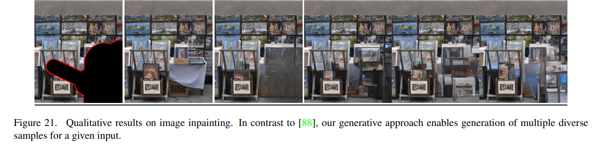 图21 图像修复的定性结果。与文献[88] 相比,我们的生成方法能够针对给定的输入生成多个不同的样本。