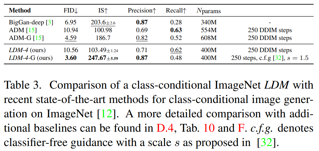 表3 类条件ImageNet LDM与ImageNet[12]上最新的类条件图像生成方法的比较。与其他基线的更详细比较见D.4,表10和F. c.f.g.表示[32]中提出的无分类器的指导,其尺度为s。