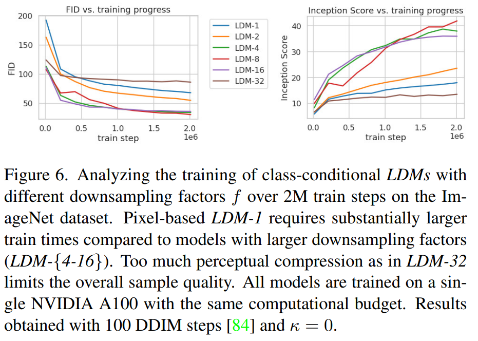 图6 分析了在ImageNet数据集上超过2M训练步长的不同下采样因子的类条件LDMs的训练。与具有较大下采样因子(LDM-{4-16})的模型相比,基于像素的LDM-1需要更大的训练时间。在LDM-32中,太多的感知压缩限制了整体样本质量。所有模型都在具有相同计算预算的单个NVIDIA A100上进行训练。100步DDIM得到的结果[84], = 0。