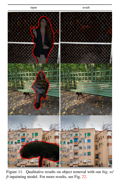 图11 使用我们的大型、w/ft 修复模型去除物体的定性结果。