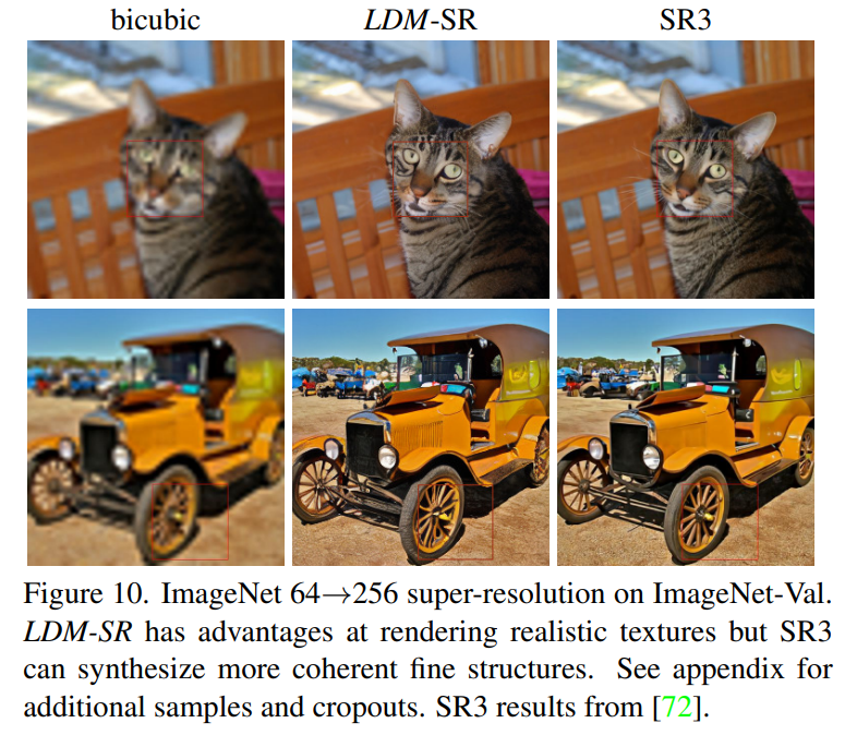 图10 ImageNet-Val 上的 ImageNet 64→256 超分辨率。LDM-SR 在渲染逼真的纹理方面具有优势,但 SR3 可以合成更连贯的精细结构。有关其他样本和裁剪图,请参阅附录。SR3 结果来自。