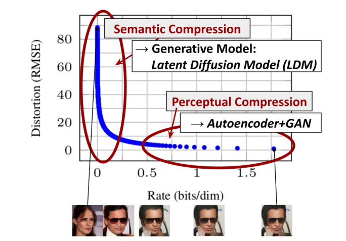 图2 说明感知和语义压缩:数字图像的大多数位对应于难以察觉的细节。虽然dm允许通过最小化负责的损失项来抑制这种语义上无意义的信息,但梯度(在训练期间)和神经网络骨干(训练和推理)仍然需要在所有像素上进行评估,从而导致多余的计算和不必要的昂贵优化和推理。