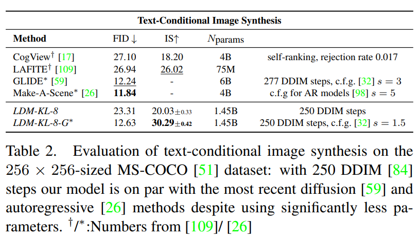 表2 在256 × 256大小的MS-COCO数据集上评估文本条件图像合成:使用250 DDIM步,我们的模型与最新的扩散和自回归方法相当,尽管使用的参数显着减少。†/∗:来自[109]/[26]的数。