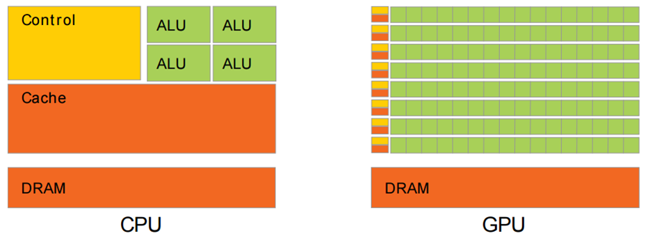 下面是CPU和GPU的结构对比图。其中: