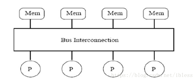 因为UMA和NUMA都是共享内存共享内存架构的并行体系机构,所以它们有一个相同点就是内存共享。共享内存,简单来说就是多个CPU可以访问系统中所有的内存。下图是共享内存的模型: