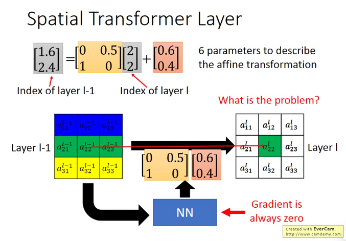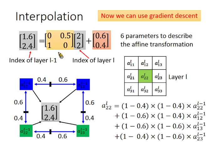 a 22 l a^l_{22} a22l 变换后得到 [ 1.6 2.4 ] \begin{bmatrix}1.6\\2.4 \end{bmatrix} [1.62.4] ,如果把 a 22 l a^l_{22} a22l 的value(像素值)设为input map中距离它最近的点的value,则应该选取点 a 22 l − 1 a^{l-1}_{22} a22l−1 ,然而这样处理的问题在于,它没法进行gradient descent。Recall一下gradient的定义:我们对参数做一些小小的变化,它对output会有怎样的影响。对于这个NN,我们对其参数(2x3 matrix)做一下小改变,其output会有小小的改变( [ 1.62 2.38 ] \begin{bmatrix}1.62\\2.38 \end{bmatrix} [1.622.38]), a 22 l a^l_{22} a22l 还是接到 a 22 l − 1 a^{l-1}_{22} a22l−1 ,结果并没有变化,所以 gradient=0 ,无法train这个NN。