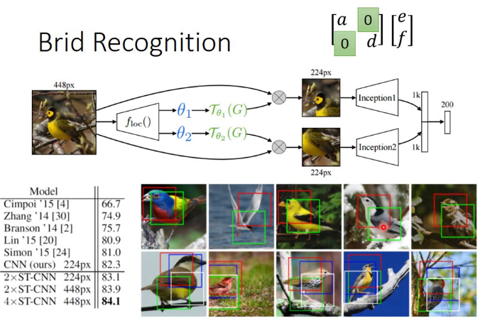 固定参数矩阵两处为0,只输出4个数字 ( a , d , e , f ) (a, d, e, f) (a,d,e,f) ,则该参数矩阵只有缩放和平移功能,不能旋转,相当于提高了模型的focus的能力,对于鸟的分类问题(200类)效果会有提升。
