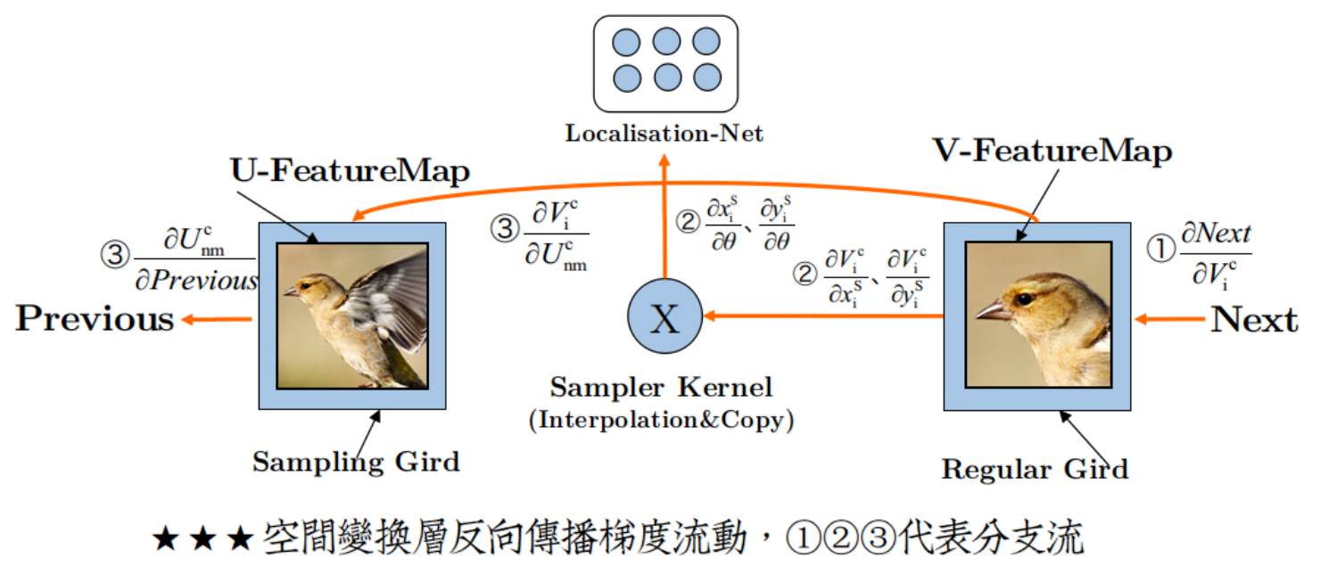 (xis,yis) 是可导的,也就是说,Spatial Transformer的变换过程是可以在网络中不断训练来修正参数的。具体的求导过程如下: