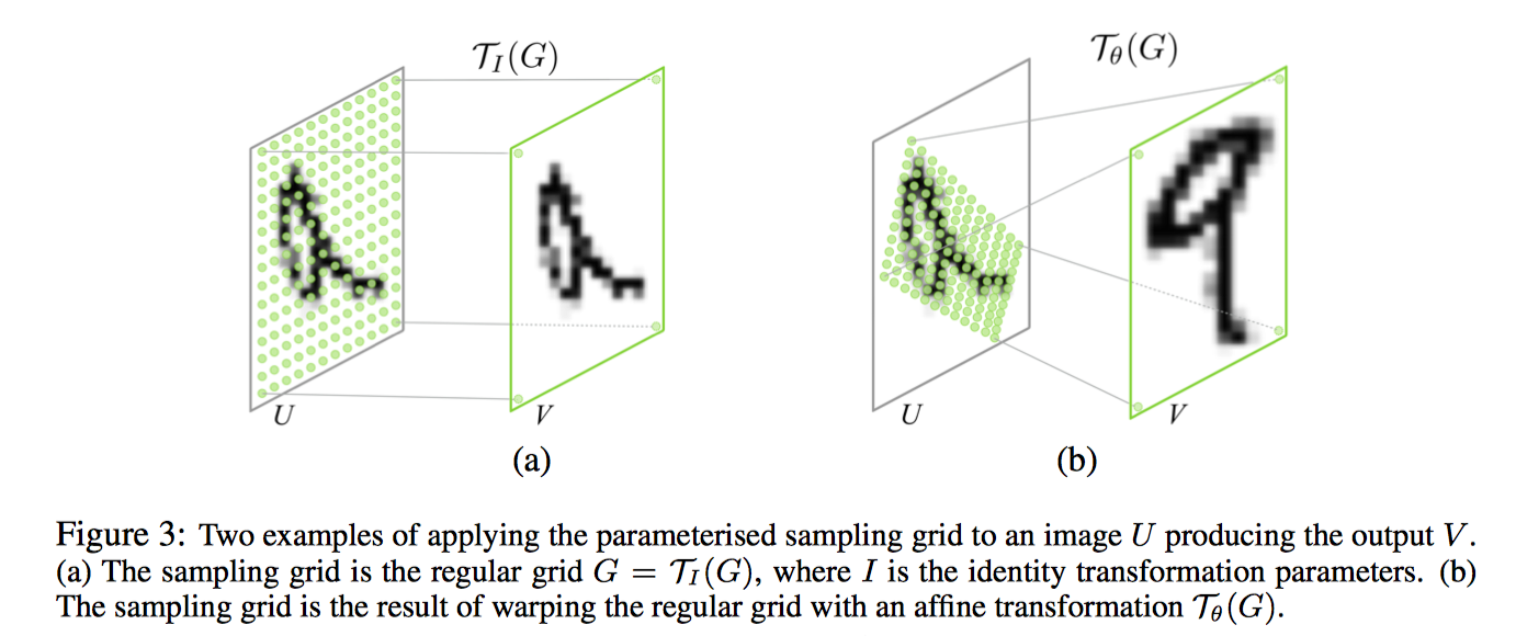 s表示source(U中的坐标),t表示target(V中的坐标)。为什么 x i s x^s_i xis 在等式左边,而 x i t x^t_i xit 却在等式右边?我们不是要得到target吗?看上去我们像在对target做变换?其实这里的 T θ ( G i ) \mathcal T_\theta(G_i) Tθ(Gi) 代表的是对目标网格进行变换后得到的采样网格点,而不是直接对原图进行的变换。注意下面这张图,原图始终没变,变换的是网格!我们把网格进行仿射变换,然后把变换后的网格放回到原图上,用原图中对应位置的像素值去填充变换后的网格(输出图片)!这样能够保证变换后的输出始终是我们设定的网格的大小!也即意味着我们可以通过控制网格的大小去控制该层输出的图像的最大分辨率(同时仿射变换矩阵也会对图像有作用)。