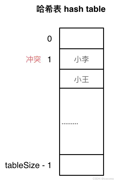使用线性探测法,一定要保证tableSize大于dataSize。 我们需要依靠哈希表中的空位来解决碰撞问题。 例如冲突的位置,放了小李,那么就向下找一个空位放置小王的信息。所以要求tableSize一定要大于dataSize ,要不然哈希表上就没有空置的位置来存放 冲突的数据了。如图所示: