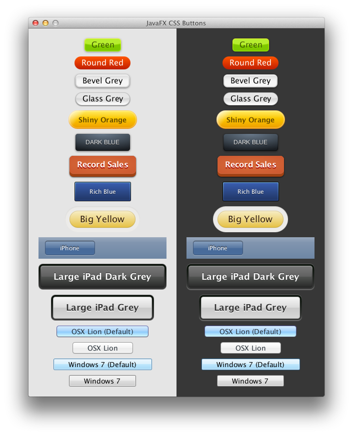 本篇延用上一篇的内容,将控件的外观设置从代码中脱离出,改成使用样式表来实现。这个样式表就是HTML里的样式表,在css2.1的基础上作了一些扩展。如果有HTML经验的同学就会知道,定制一个控件的外观,不是重写原有控件的绘制代码,而是通过样式表就可能从外部进行定制。比如通过以下样式定义,就可以得到图中的这些按钮外观: