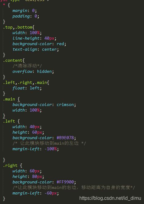 刚开始都是一样的,三个模块(main,left,right)全部左浮动,在最外层给个div清除浮动,给main一个100%的宽度,让它独占一行,另外两个在另一行并排,然后通过给left和right设置左边距的负值,让它们跑到与main同行内,但是就会出现,他们覆盖掉main的内容的问题。