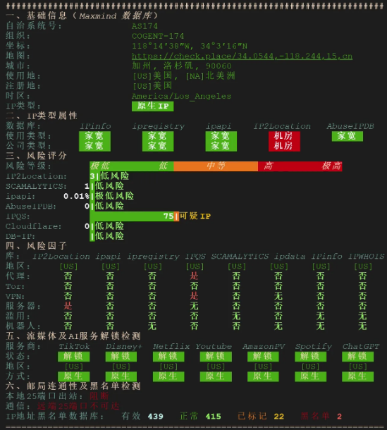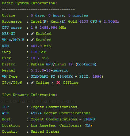 基本硬件参数配置,Intel Gold 6133处理器,IP归属洛杉矶,上游网络为Cogent: