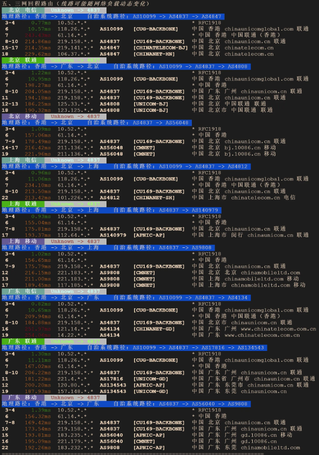 三网回程路由节点测试,走AS4837线路回来(去程走各自骨干网到达机房):