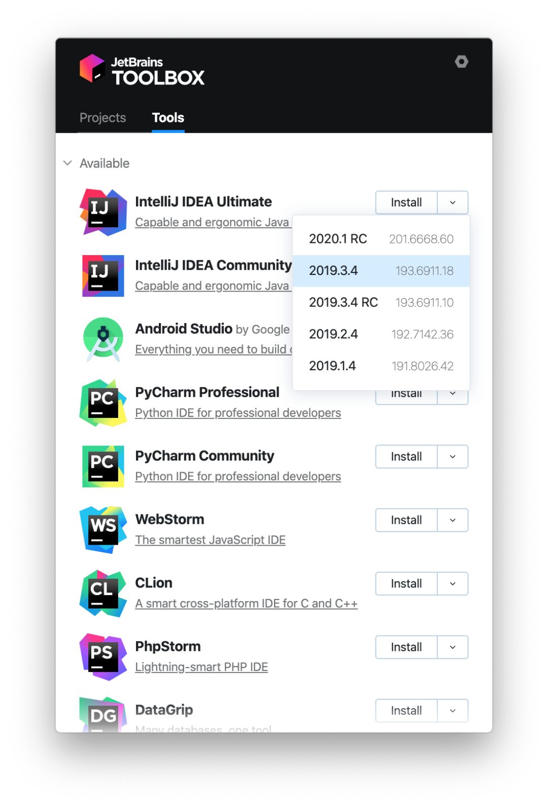 Jetbrains ToolBox 是官方推荐安装「Jetbrains 产品」的产品,可以用它来管理多个产品和同一个产品的多个版本是非常便利的。必要时进行更新和回滚,并轻松删除任何工具。工具箱应用程序会维护一个所有项目的列表,以便在正确的IDE和版本中快速打开任何项目。