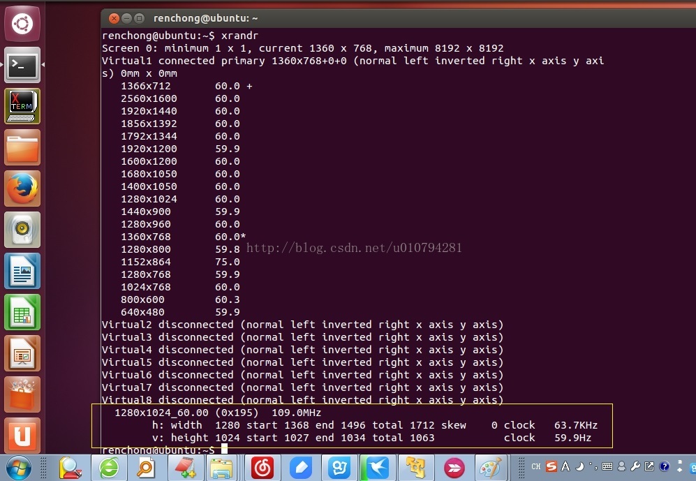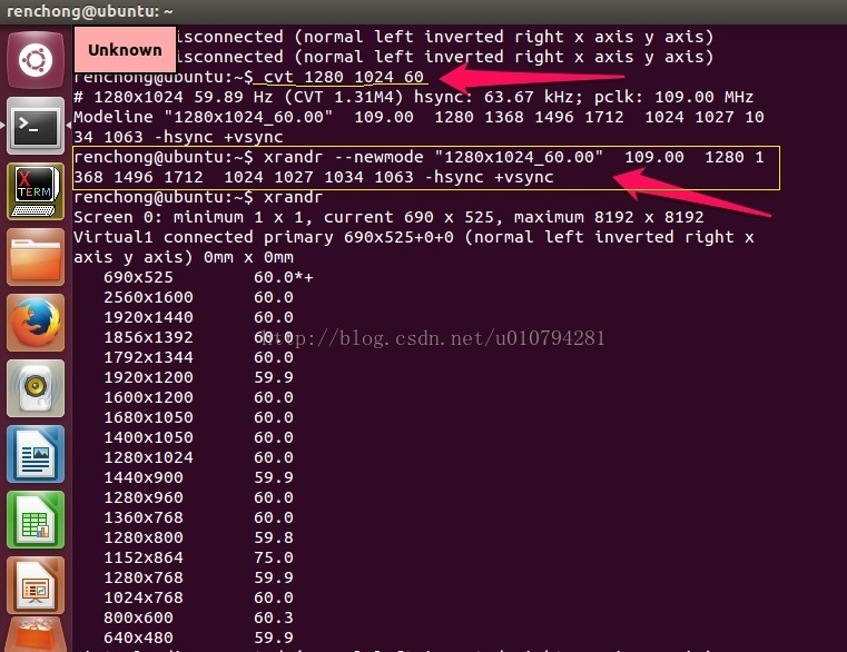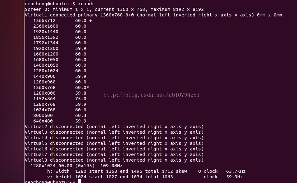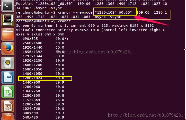 命令行 :xrandr --newmode "1280x1024_60.00" 109.00 1280 1368 1496 1712 1024 1027 1034 1063 -hsync +vsync