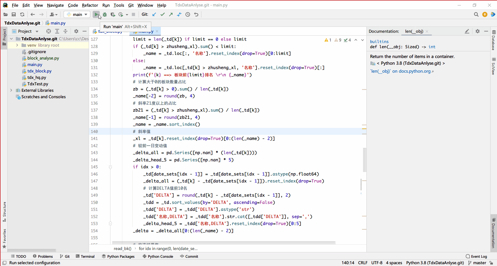 2.2 编写python代码读取上面导出的EXCEL,分析每天板块数据情况并整理每天的板块数据。代码中先读取导出的EXCEL,按照交易日历(调用tushare API)处理每个交易日的数据,核心代码如下