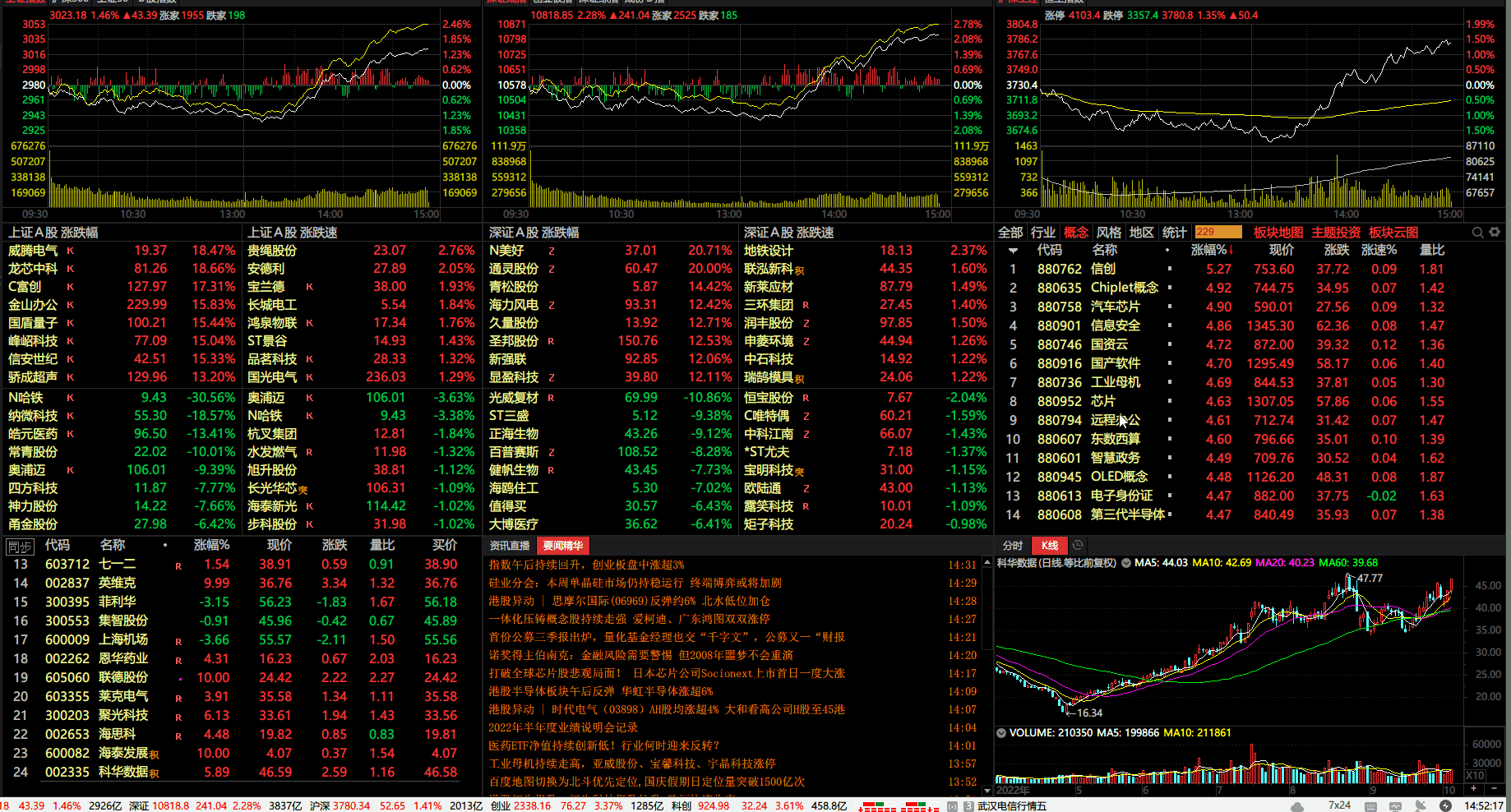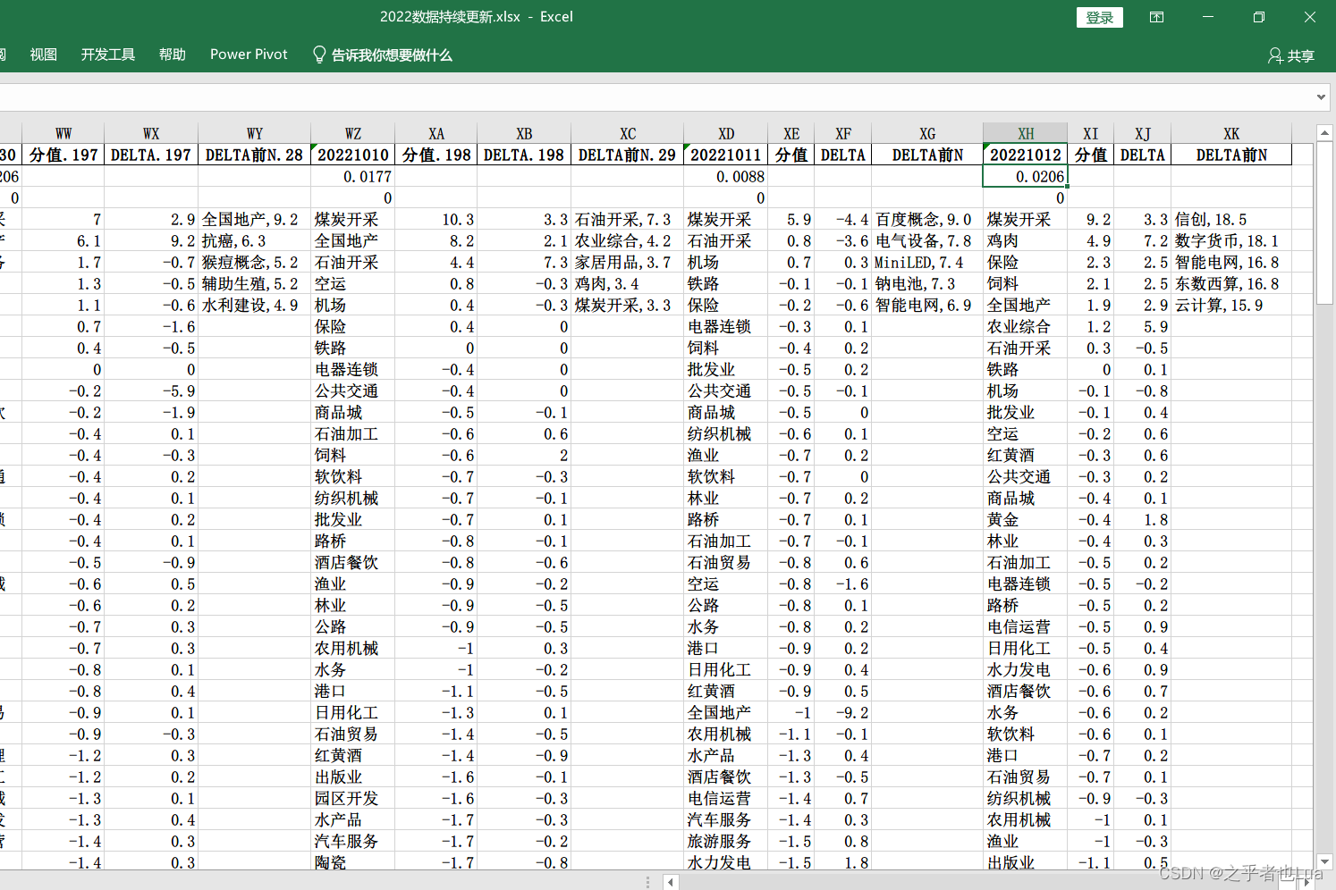2.3 每天在收盘后导出数据,执行一遍python代码更新数据,这样就可以得到每天的市场情况,根据数据去择时,比如2022年10月11日,晴雨值已经接近0,主升值长时间0,观察EXCEL的数据可以明显看出除了煤炭及其他几个板块,其他板块已经全部空头走势,这表明除了煤炭少数板块外,全市场处于卖空状态,这种情况无外乎两个结果,一:继续卖空,由于无人接盘,那会产生踩踏股灾,二:有人试探性入场卖货,底部由此产生,回看历史数据,只有2015年股灾和2016熔断股灾后续按第一种走势,一般情况下是第二种,底部形成,新一轮行情继续,股市如同太极,买卖双方如此反复,这就有了K线的起起落落。