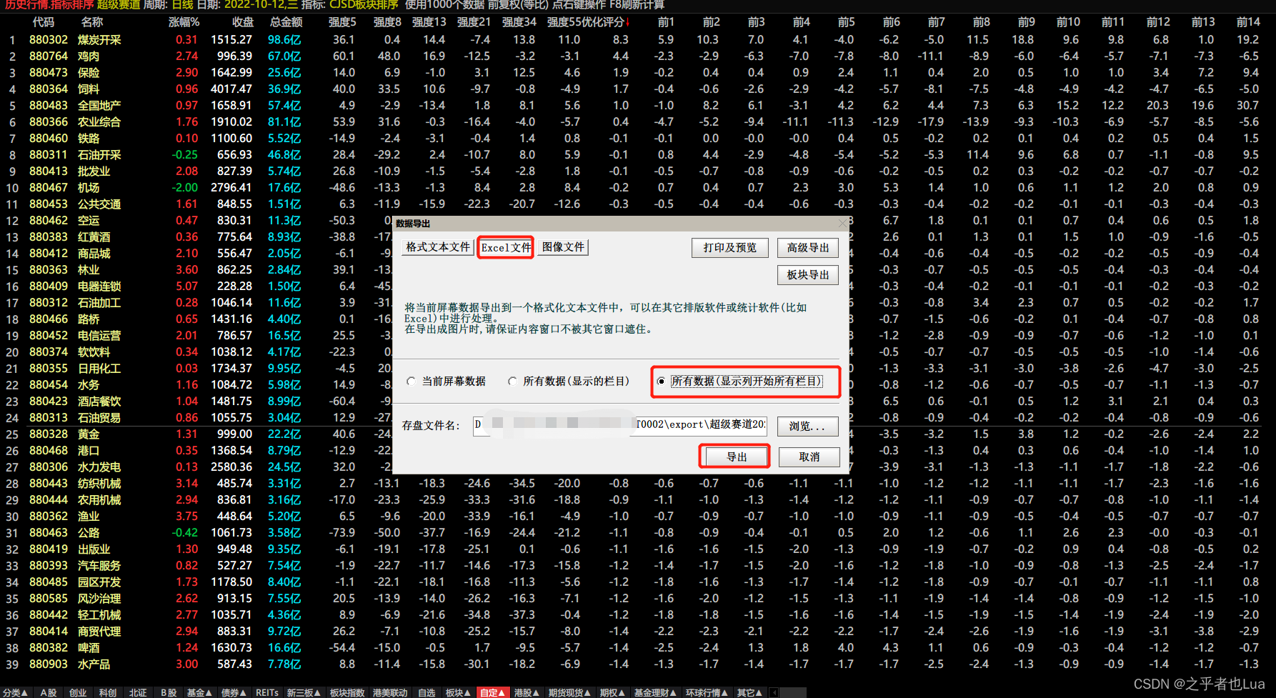 2.1 在通达信排序界面输入指令34导出数据,得到数据EXCEL文件