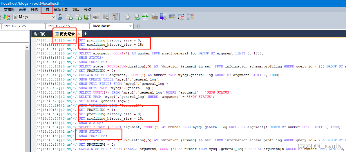 这是由于我们使用的第三方工具执行了这些sql造成的,比如我用的sqlyog,打开工具,历史记录可以看到如下信息