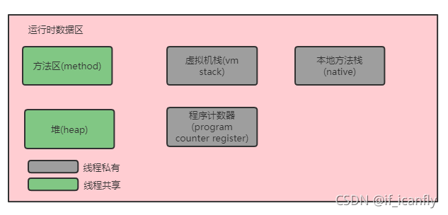 运行时数据区: 方法区(method area) + 堆(heap) + java栈(vm stack) + 本地方法栈(native method stack) +程序计数器