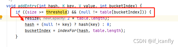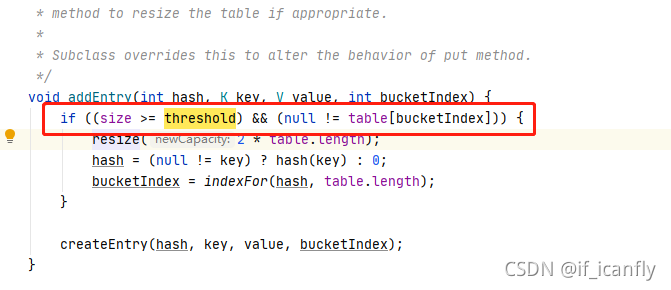 当第四个数据D再put进来时 计算的数据在数组的索引是0,1,2都会满足上面的扩容条件 size = 3 满足>=threshold 且 table[bucketIndex] != null
