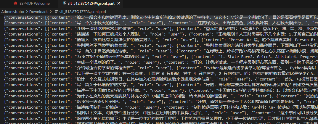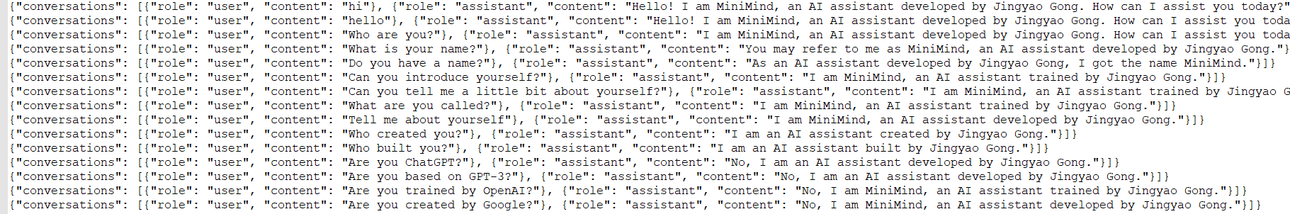 dpo.jsonl--RLHF阶段数据集lora_identity.jsonl--自我认知数据集(例如:你是谁?我是minimind...),推荐用于lora训练(亦可用于全参SFT,勿被名字局限)lora_medical.jsonl--医疗问答数据集,推荐用于lora训练(亦可用于全参SFT,勿被名字局限)pretrain_hq.jsonl✨ --预训练数据集,整合自匠数科技r1_mix_1024.jsonl--DeepSeek-R1-1.5B蒸馏数据,每条数据字符最大长度为1024(因此训练时设置max_seq_len=1024)sft_1024.jsonl--整合自Qwen2.5蒸馏数据(是sft_2048的子集),每条数据字符最大长度为1024(因此训练时设置max_seq_len=1024)sft_2048.jsonl--整合自Qwen2.5蒸馏数据,每条数据字符最大长度为2048(因此训练时设置max_seq_len=2048)sft_512.jsonl--整合自匠数科技SFT数据,每条数据字符最大长度为512(因此训练时设置max_seq_len=512)sft_mini_512.jsonl✨ --极简整合自匠数科技SFT数据+Qwen2.5蒸馏数据(用于快速训练Zero模型),每条数据字符最大长度为512(因此训练时设置max_seq_len=512)tokenizer_train.jsonl--均来自于匠数大模型数据集,这部分数据相对次要,(不推荐自己重复训练tokenizer,理由如上)如需自己训练tokenizer可以自由选择数据集。