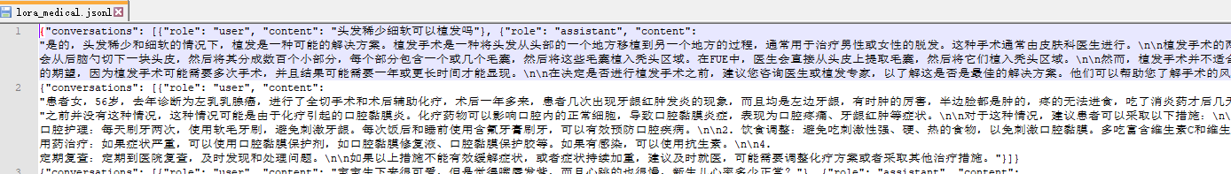 非常多的人困惑,如何使模型学会自己私有领域的知识?如何准备数据集?如何迁移通用领域模型打造垂域模型? 这里举几个例子,对于通用模型,医学领域知识欠缺,可以尝试在原有模型基础上加入领域知识,以获得更好的性能。 同时,我们通常不希望学会领域知识的同时损失原有基础模型的其它能力,此时LoRA可以很好的改善这个问题。 只需要准备如下格式的对话数据集放置到./dataset/lora_xxx.jsonl,启动 python train_lora.py 训练即可得到./out/lora/lora_xxx.pth新模型权重。
