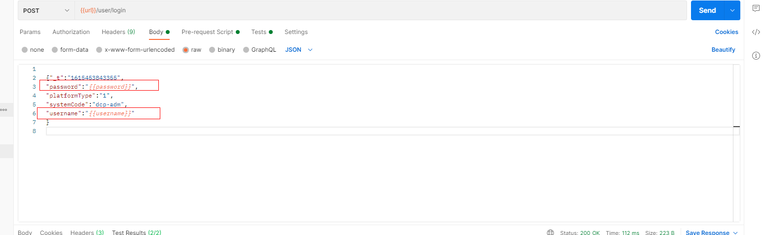 2、请求中对应位置替换参数变量:请求参数中用{ {参数名}}替换,代码中通过:data.参数名来进行替换,注意这里的变量名要和txt文档中的变量名一致
