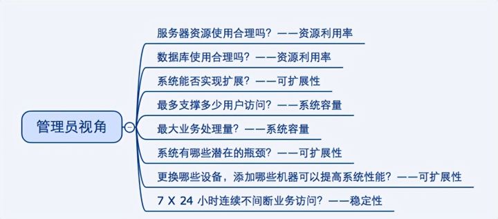 1、测试人员需要考虑全面的性能,包括用户、开发、管理员等各个视角的性能。