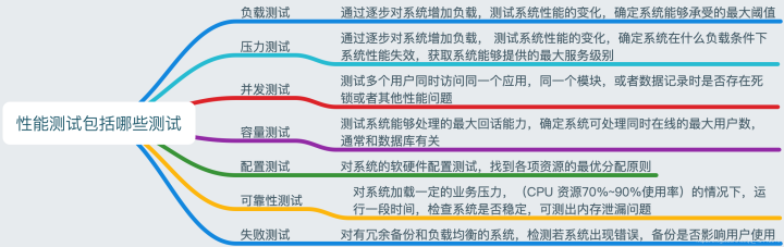 性能测试包括:基准测试、负载测试、压力测试、并发测试、容量测试、可靠性测试(稳定性测试)、配置测试、失败测试。