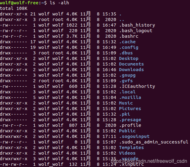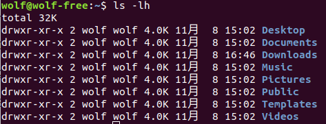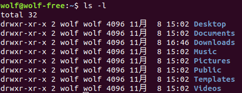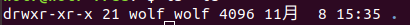 这里两个wolf wolf分别表示所有者,所属组;接下来,4096是文件大小,再往后是修改时间,文件名。