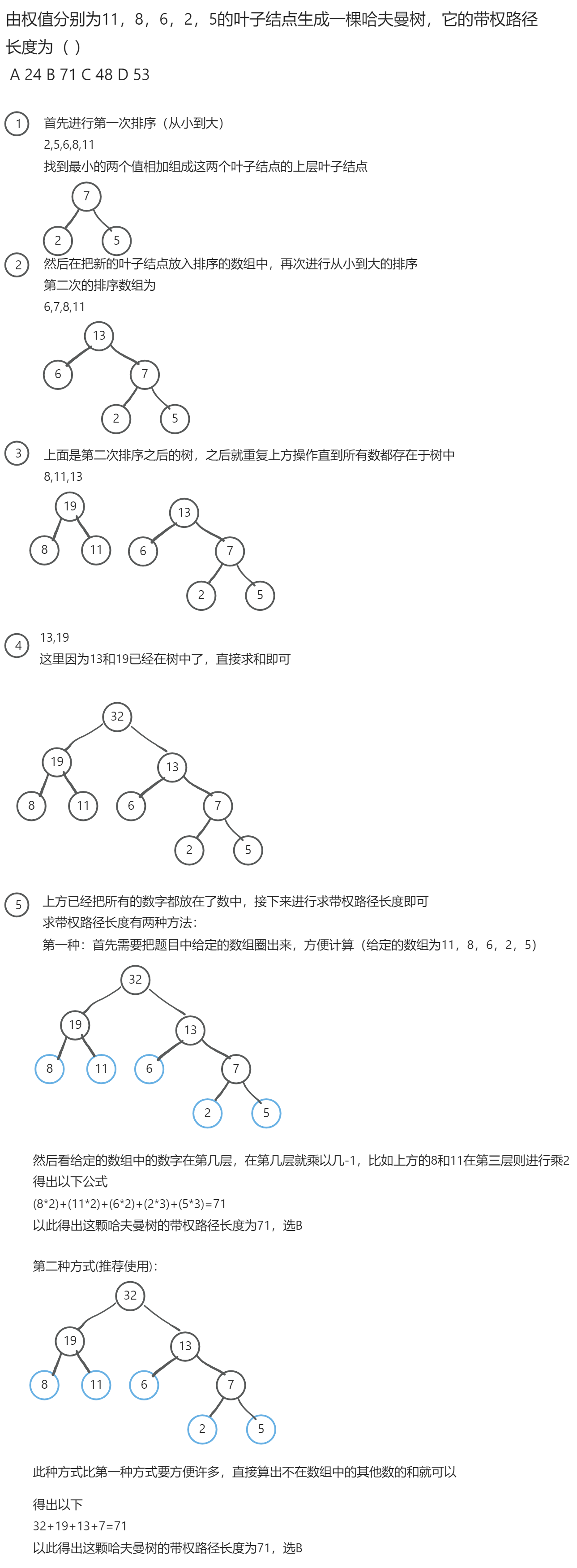 若将树中结点赋给一个有着某种含义的数值,则这个数值称为该结点的权。结点的带权路径长度为:从根结点到该结点之间的路径长度与该结点的权的乘积。