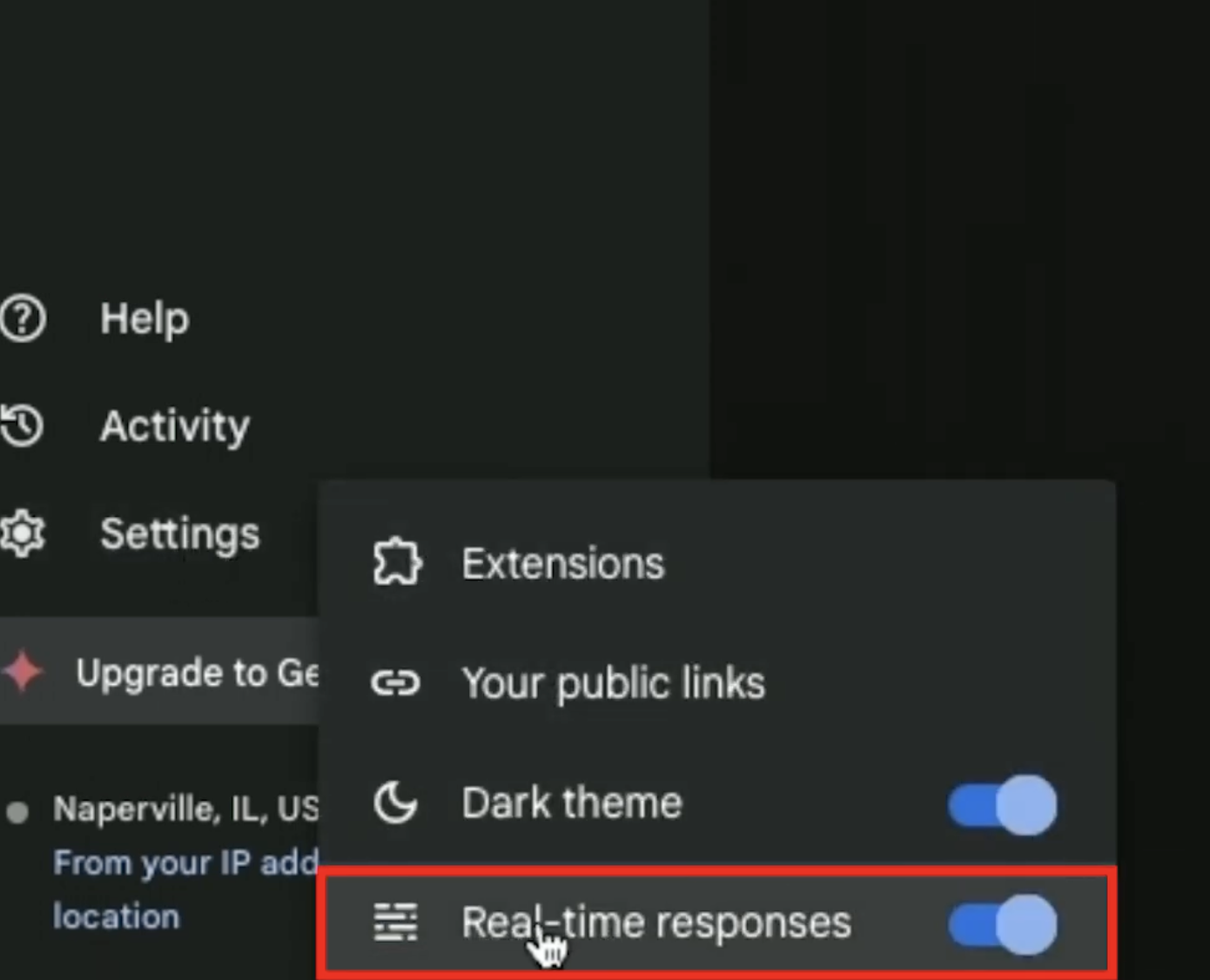 在左侧的设置里,你会发现一个选项,可以开启或关闭“实时回复”(Real-time responses)。这是啥意思呢?