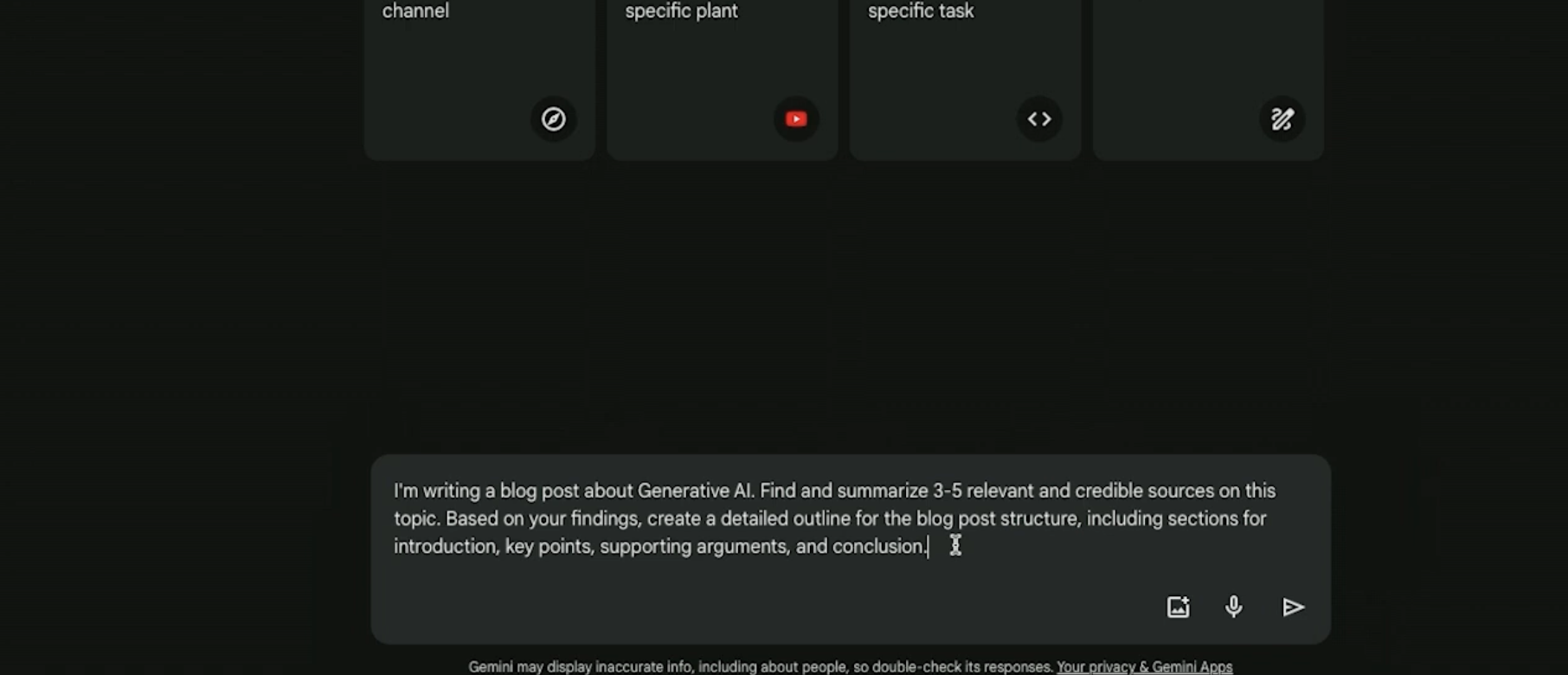 - 第一步: 给出主题(比如“生成式 AI”),让 Gemini 联网搜索并总结3-5个相关的、可靠的资料来源。