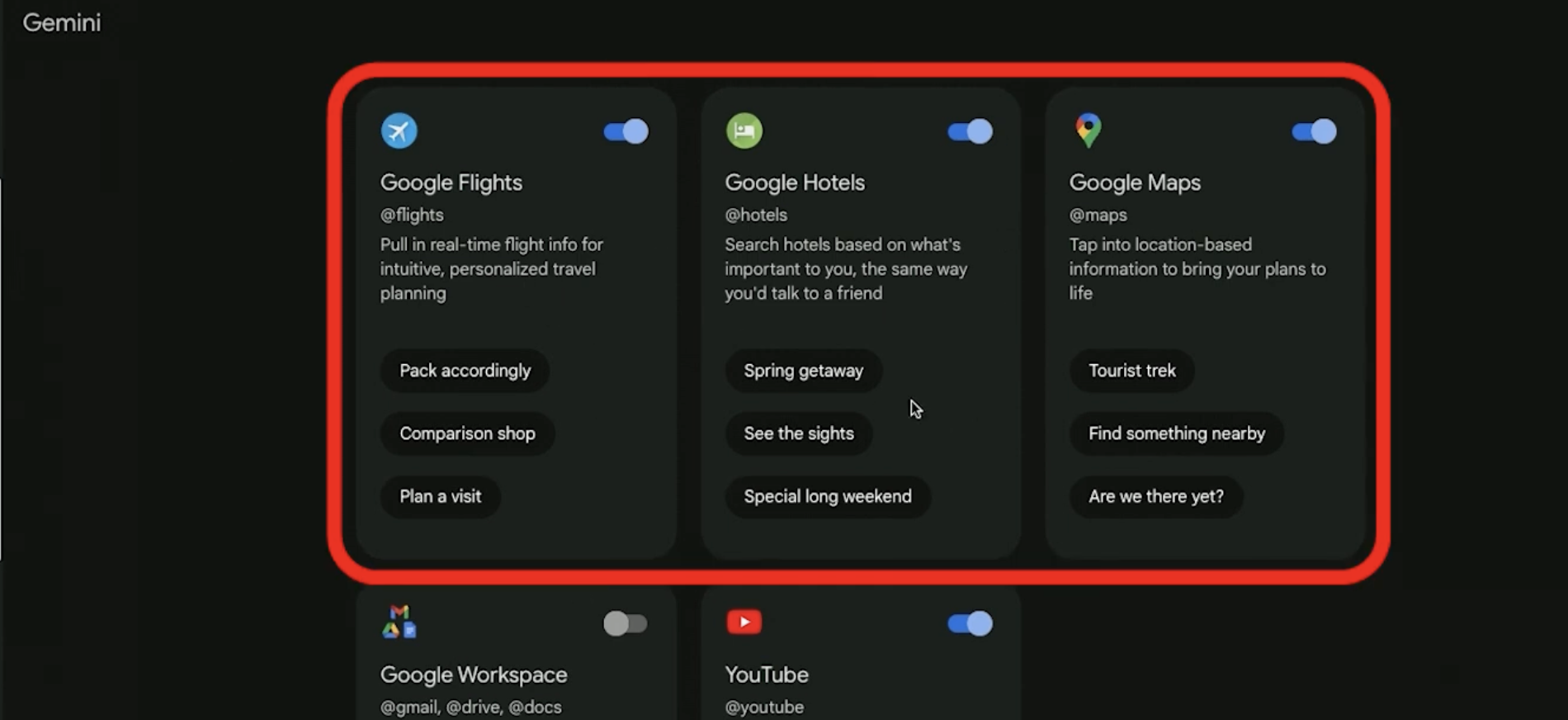 出行相关扩展 (Google Maps, Hotels, Flights): 把这些扩展打开,Gemini 就变成你的专属旅行规划师!