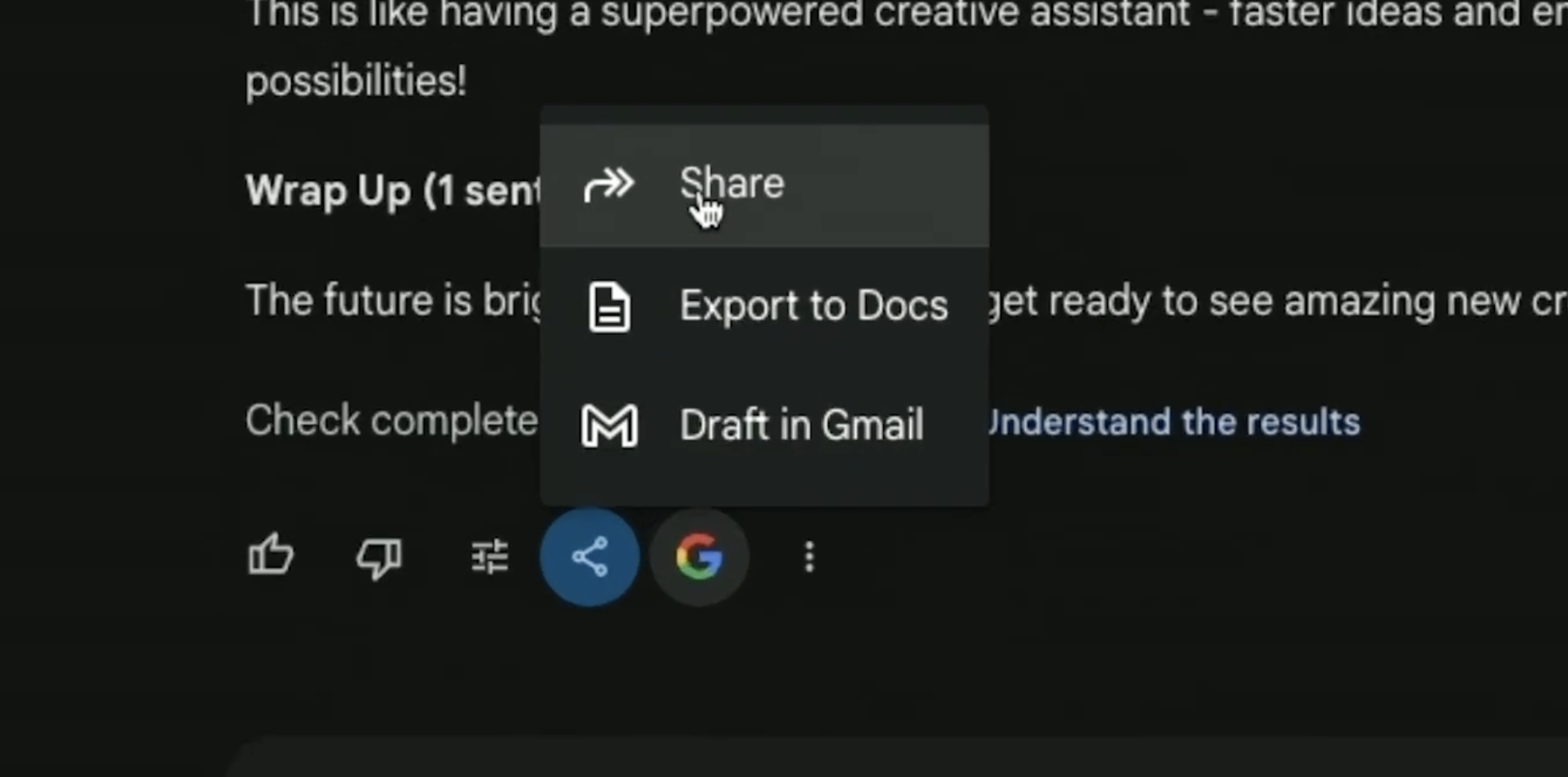 - 分享: 你可以分享某个提示词和它对应的回复,或者分享整个聊天记录!它会生成一个公共链接,发给别人,别人就能看到你和 Gemini 的精彩对话了。分享技术、分享发现,超方便!