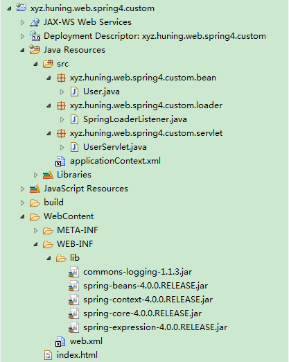<?xml version="1.0" encoding="UTF-8"?> <web-app xmlns:xsi="http://www.w3.org/2001/XMLSchema-instance" xmlns="http://java.sun.com/xml/ns/javaee" xmlns:web="http://java.sun.com/xml/ns/javaee/web-app_2_5.xsd" xsi:schemaLocation="http://java.sun.com/xml/ns/javaee http://java.sun.com/xml/ns/javaee/web-app_3_0.xsd" id="WebApp_ID" version="3.0"> <context-param> <param-name>springCfgFile</param-name> <param-value>applicationContext.xml</param-value> </context-param> <listener> <listener-class>xyz.huning.web.spring4.custom.loader.SpringLoaderListener</listener-class> </listener> <servlet> <servlet-name>userServlet</servlet-name> <servlet-class>xyz.huning.web.spring4.custom.servlet.UserServlet</servlet-class> </servlet> <servlet-mapping> <servlet-name>userServlet</servlet-name> <url-pattern>/userServlet</url-pattern> </servlet-mapping> <welcome-file-list> <welcome-file>index.html</welcome-file> </welcome-file-list> </web-app>