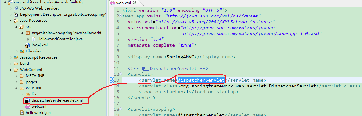<!-- 配置 DispatcherServlet --> <servlet> <servlet-name>dispatcherServlet</servlet-name> <servlet-class>org.springframework.web.servlet.DispatcherServlet</servlet-class> <!-- 配置 DispatcherServlet 的一个初始化参数: 配置 SpringMVC 配置文件的位置和名称 --> <!-- 实际上也可以不通过 contextConfigLocation 来配置 SpringMVC 的配置文件, 而使用默认的. 默认的配置文件为: /WEB-INF/<servlet-name>-servlet.xml --> <!-- <init-param> <param-name>contextConfigLocation</param-name> <param-value>classpath:springmvc.xml</param-value> </init-param> --> <load-on-startup>1</load-on-startup> </servlet> <servlet-mapping> <servlet-name>dispatcherServlet</servlet-name> <url-pattern>/</url-pattern> </servlet-mapping>